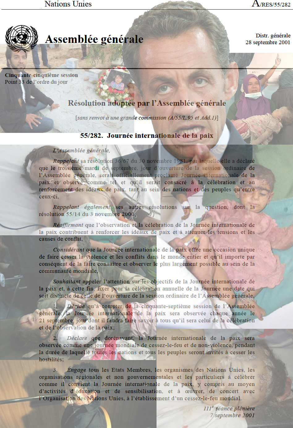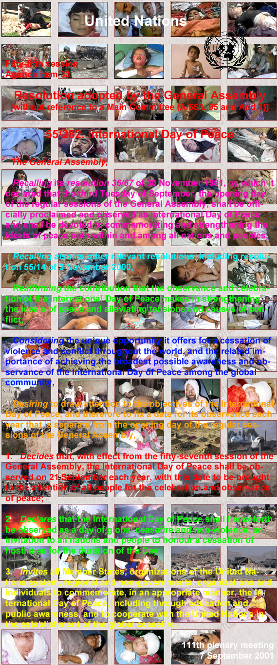 Desejando chamar a atenção para os objetivos do Dia Internacional da Paz, e, portanto, fixar uma data para a sua observância a cada ano que é separado do dia da abertura das sessões ordinárias da Assembléia Geral,