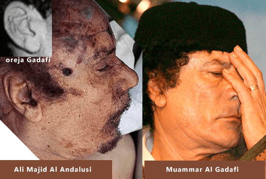 De acordo com relatos que acabam de nos chegar, o mártir humilhado e apresentado como sendo Muammar Al-Gaddafi, em vídeos e fotografias que tem dado a volta ao mundo, foi identificado e se chamava na realidade Ali Majid Al Andalus, era um habitante de Sirte e era famoso na Líbia por sua semelhança com o Guia irmão da revolução El Fateh.