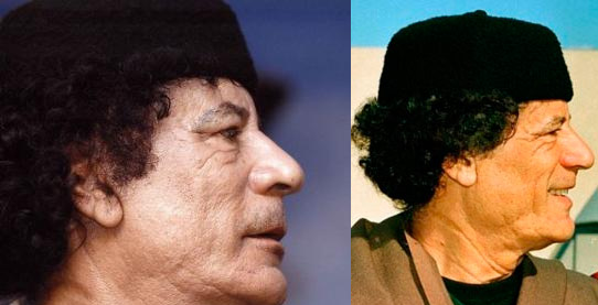 O homem na foto, com o buraco de bala na cabeça, não é Muammar Al-Qaddafi, mas o seu sósia, que se fazia chamar “Ahmid“. Olhe para seu rosto e compare-o com aquele do verdadeiro Muammar Al- Qaddafi.