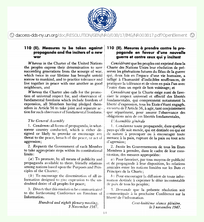 . . .1. Condena todas as formas de propaganda, em qualquer país que sejam conduzidas, que seja destinada ou que seja de natureza a provocar ou a encorajar qualquer ameaça à paz, à violação da paz, ou ato de agressão;