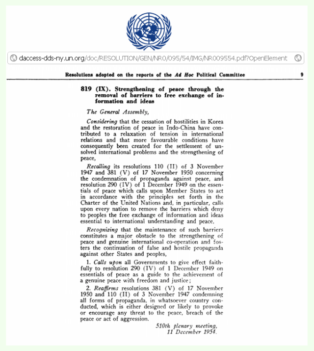 Lembrando suas resoluções 110 (II), de 03/11/1947, e 381 (V), de 17/11/1950, concernentes à condenação da propaganda contra a paz, e sua resolução 290 (IV), de 01/12/1949, sobre os princípios essenciais da paz, que convoca os Estados Membros a agirem conforme os princípios enunciados na Carta das Nações Unidas e, em particular, convoca todas as nações a removerem as barreiras que impedem os povos de procederem ao livre intercâmbio de informações e de idéias essencial ao entendimento internacional e à paz.