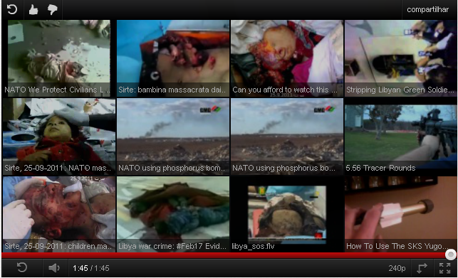 Assista abaixo alguns dos filmes que se tornaram sucessos mundiais da última Mostra Internacional de Cinema na Líbia, dirigidos por Barack Obama e Hillary Clinton, dos EEUU; Nicolas Sarkozy da França; David Cameron, da Inglaterra; Hamad Bin Khalifa, do Qatar; Anders Fogh Rasmussen, da OTAN, e vários outros hipócritas, utilizando como protagonistas e coadjuvantes a própria população da Líbia.
