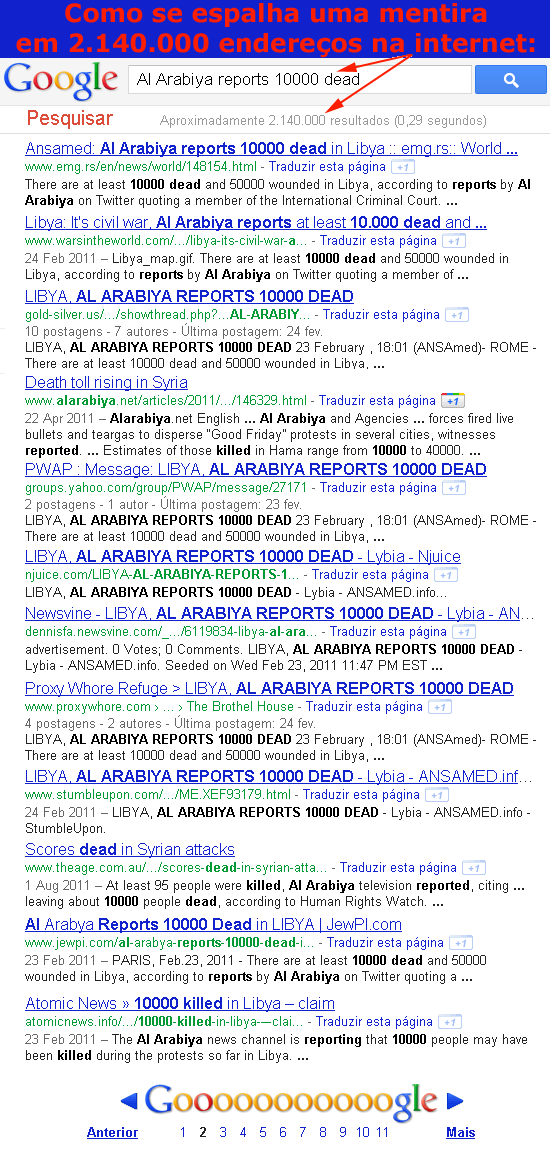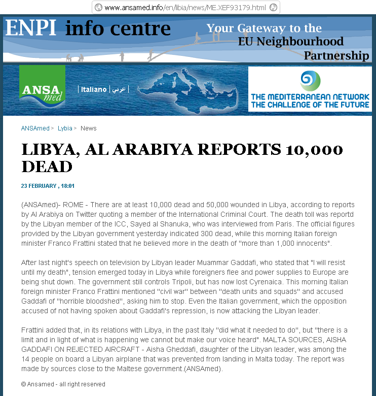 A mãe de todas as mentiras foi enviada ao mundo através de uma mensagem do twitter por Al Arabiya, em 23 de fevereiro de 2011. Uma mensagem que induz a acreditar que Qaddafi é um Hitler ainda mais ultrajante e cruel: “a repressão na Líbia tem já alegados 10.000 mortos e 50.000 feridos.”