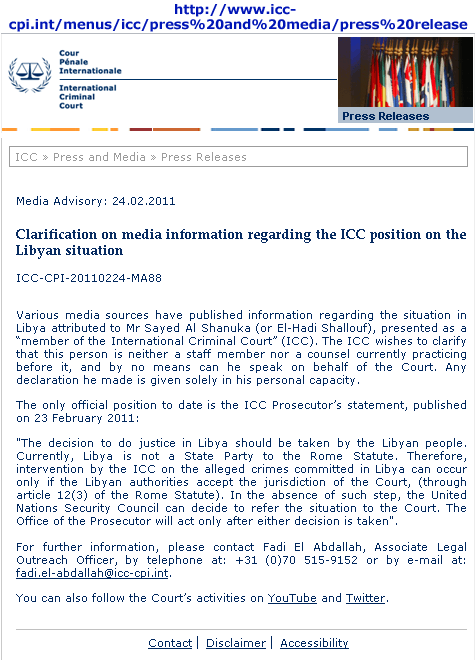 Em 24/02/2011, o Tribunal Penal Internacional (ICC) divulgou para todos os meios de comunicação (Media Advisory: 24.02.2011):