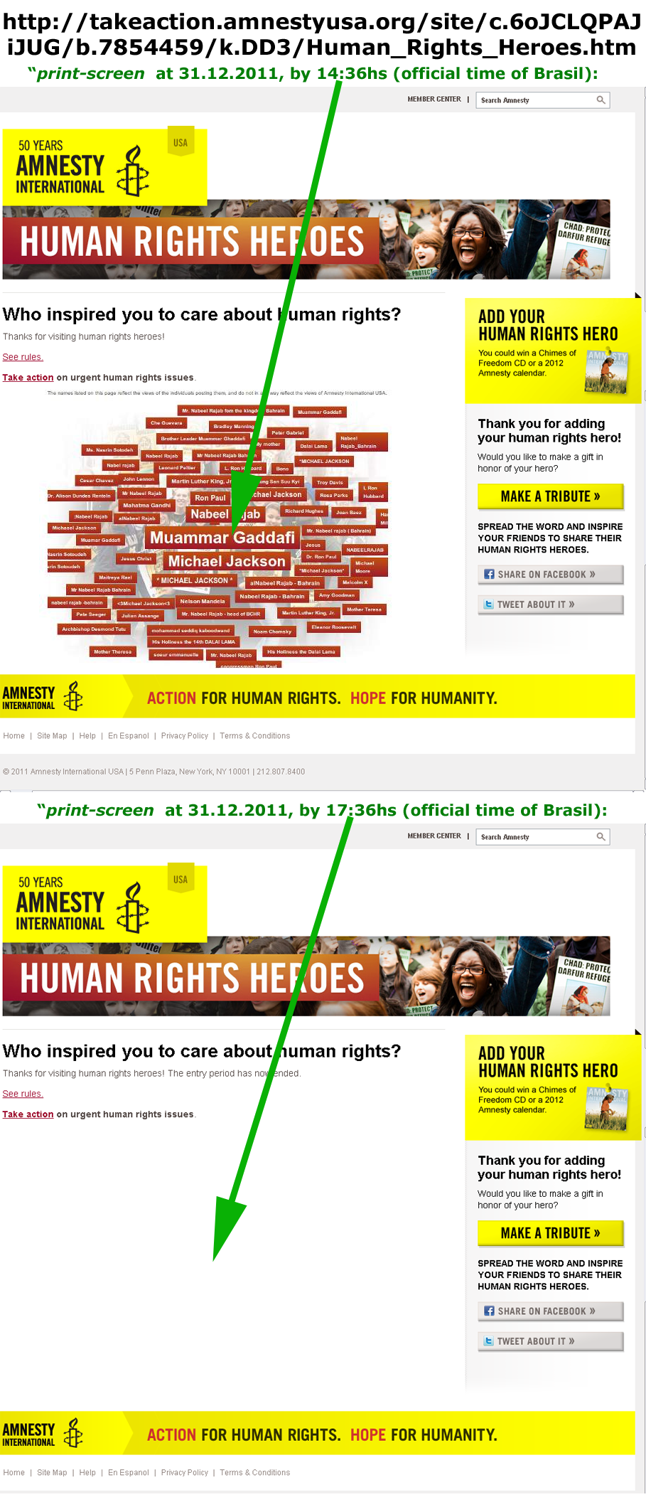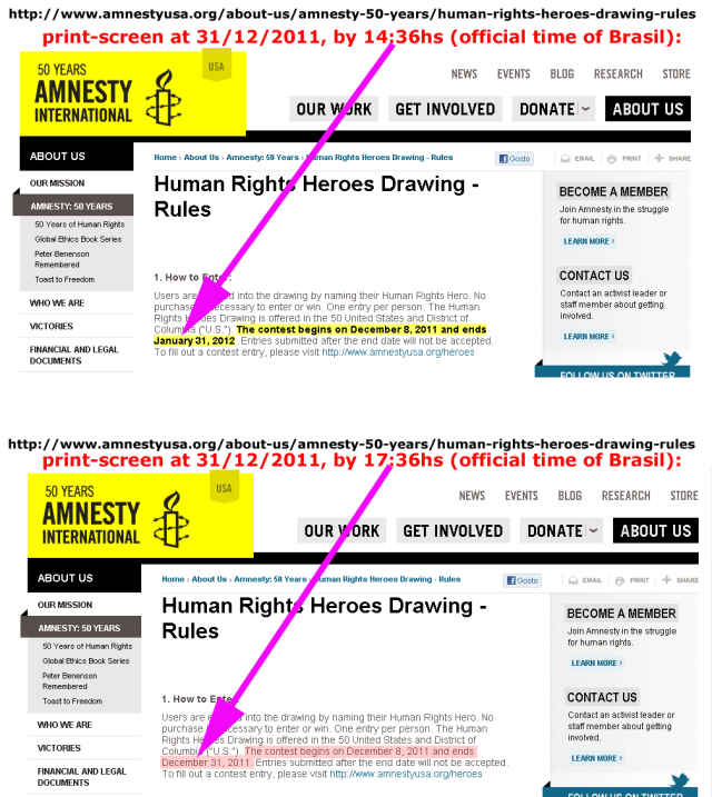 Veja como, em algumas horas no último dia do ano de 2011, as regras foram mudadas e o assunto sumiu da página da Anistia Internacional na Internet: