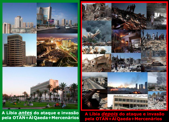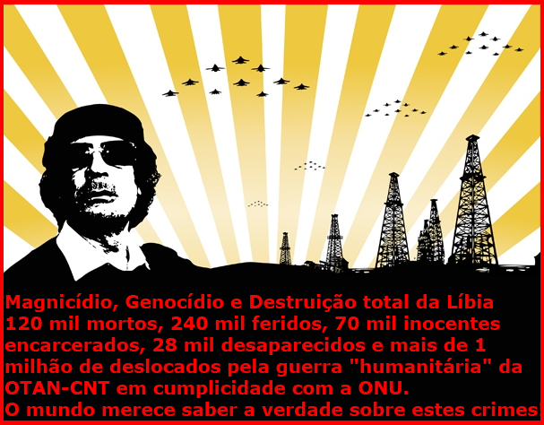 A Grande Mídia Mentirosa não está noticiando e os hipócritas cidadãos europeus não querem saber: a população líbia, que apoiava (e ainda apoia) a Jamahiriya, está sendo massacrada pelas forças armadas da OTAN e da Al Qaeda, num escandaloso processo de genocídio e expulsão de seu território, para nele serem instalados milhares de estrangeiros que estão entrando no país como novos moradores e colonizadores. Tudo isso porque o verdadeiro povo líbio quer continuar a viver uma vida boa e digna como sempre viveram nos 40 anos da Jamarihiya Árabe Socialista Líbia.