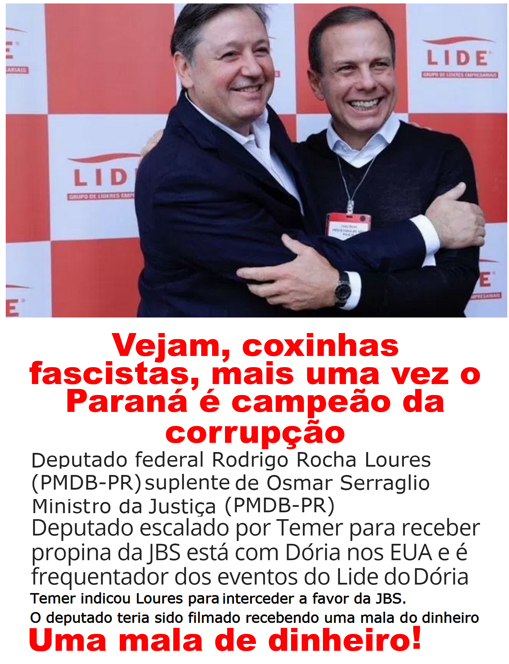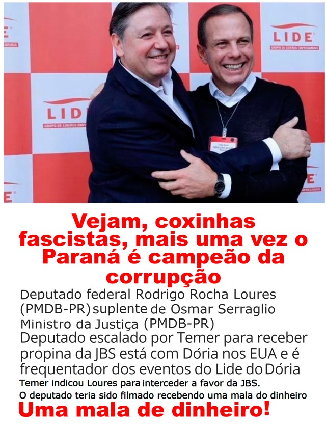 Até hoje eu nunca entendi essa raiva e ódio manifestados pelos coxinhas fascistas do Paraná contra corruptos de outros estados, tendo na própria cara, nariz e estado seus corruptos de causar inveja a quaisquer outros como o caso BANESTADO (a maior corrupção de bilhões de R$ de nosso país), os casos de Maringá (com assassinato de Luiz Antônio Paolicchi) com testemunha de defesa de Sergio Moro, os diversos outros casos de Leiner/Beto Richa e seus fiscais em Curitiba/Londrina/Maringá/Foz de Iguaçu.