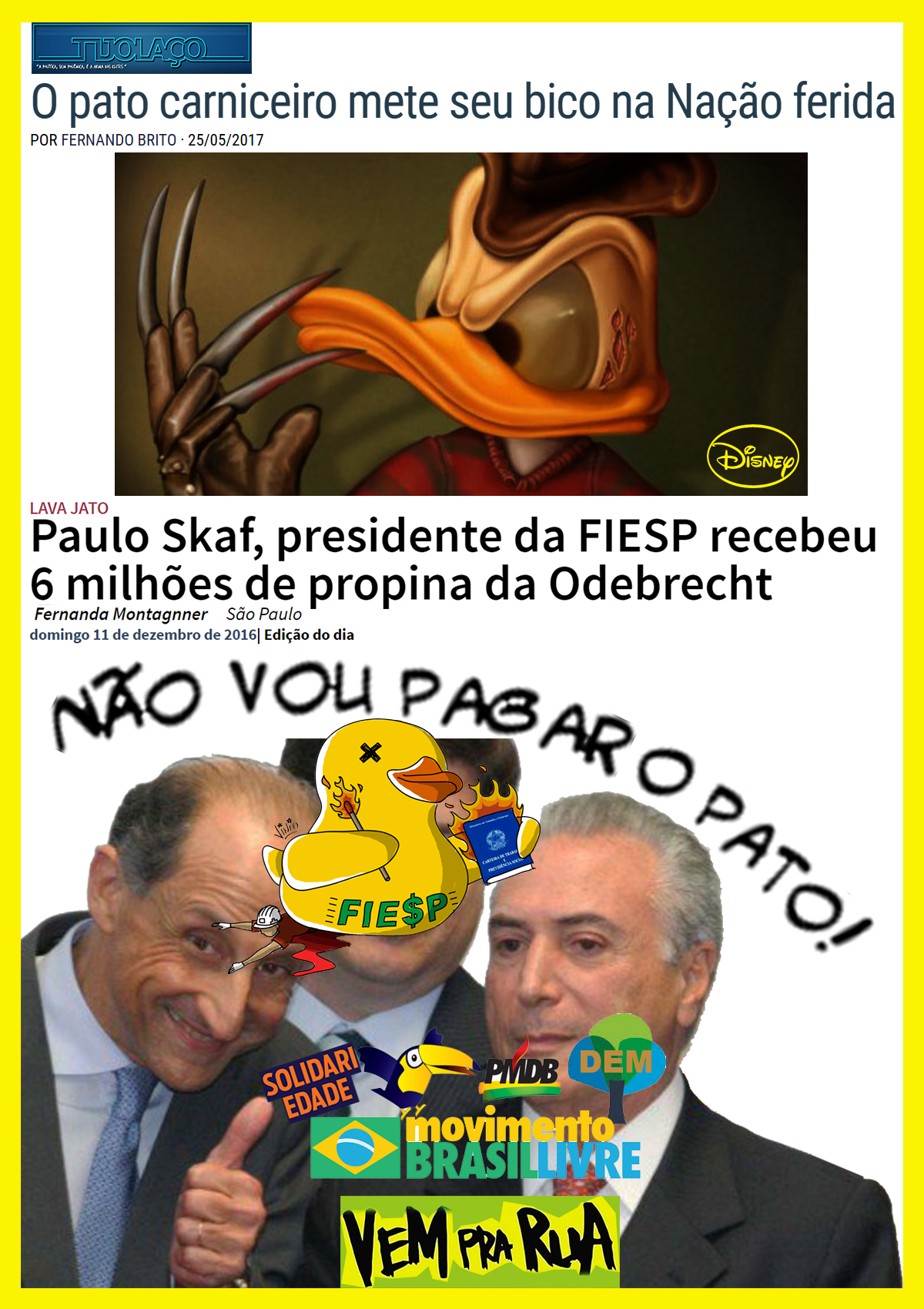 Skaf, o corrupto da FIESP, patrono do Pato roubado, do Kataguiri MBL e do Chequer VemPráRua, foi e é sócio do brimo Temer: