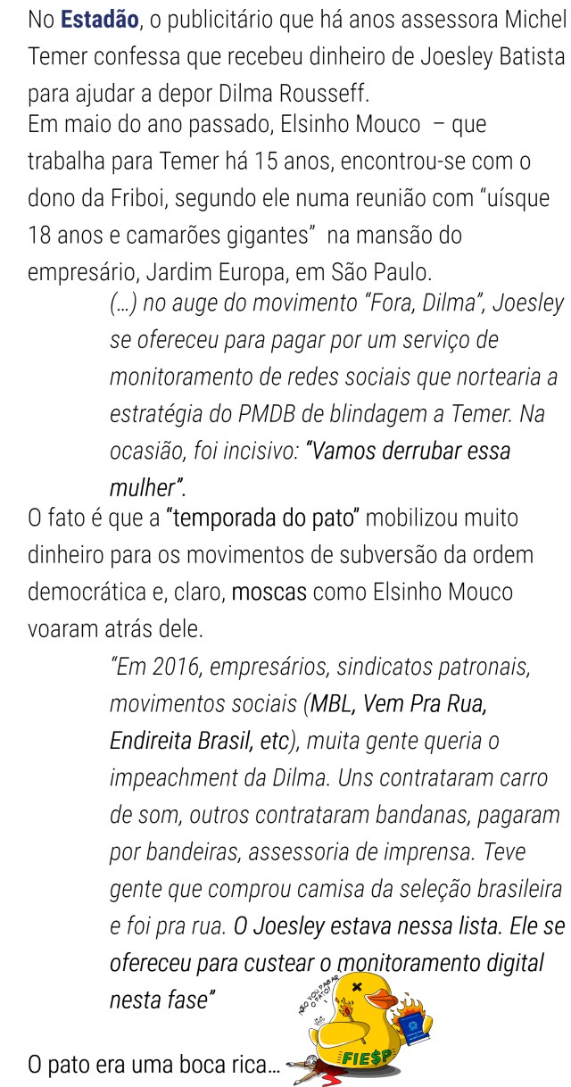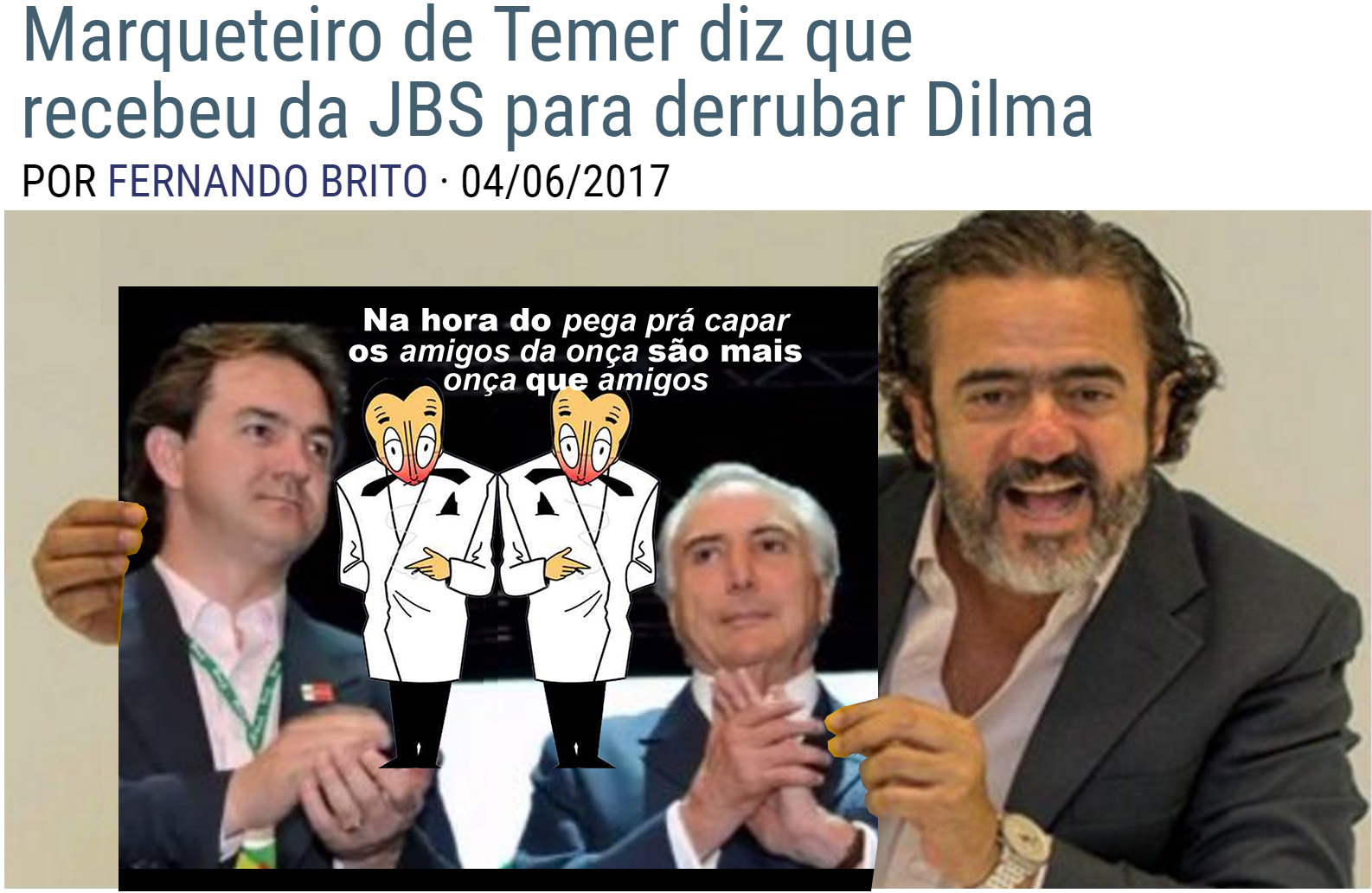 Joesley da Friboi (que não é do Lulinha), financia o golpe contra Dilma que não compactua com suas falcatruas. jun4 r humborges Compartilhe isso: Clique para compartilhar no X(abre em nova janela) 18+ Clique para compartilhar no Facebook(abre em nova janela) Facebook Mais Clique para compartilhar no WhatsApp(abre em nova janela) WhatsApp Curtir Carregando... Relacionado