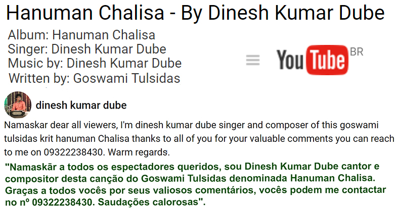 A versão a seguir está publicada na escrita alfabeto-silábica hindu denominada devanāgarī, na transliteração fonética inglesa para o alfabeto latino denominada hunteriana e na língua portuguesa traduzida da versão inglesa publicada na Wikipedia a partir de traduções dos estudiosos da Gita Press, de Cheeni Rao, de Pandit Vijay Shankar Mehta e de Jagadguru Rambhadracharya.