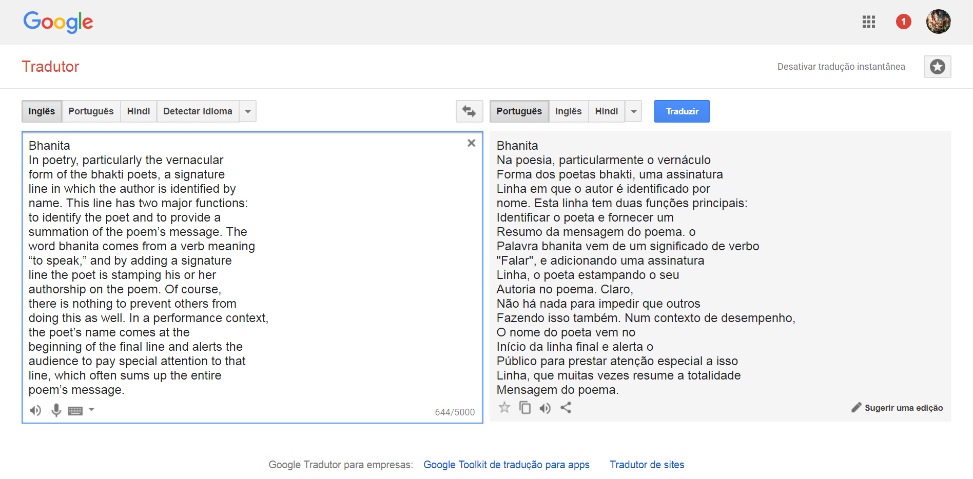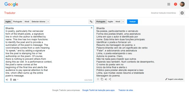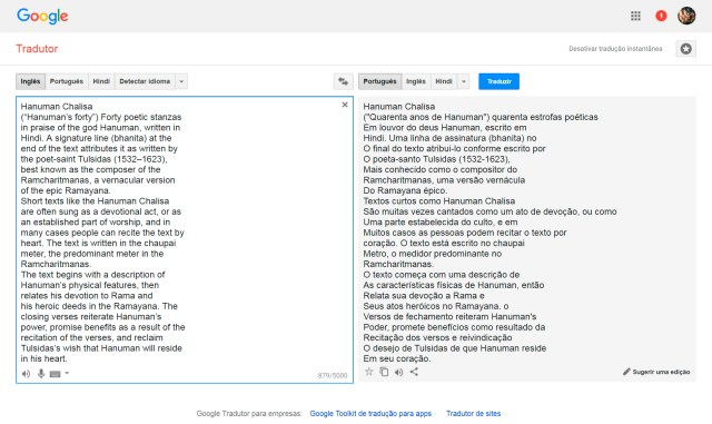 Copiados os textos colamo-los no Google Tradutor, solicitando a tradução do Inglês para o Português: