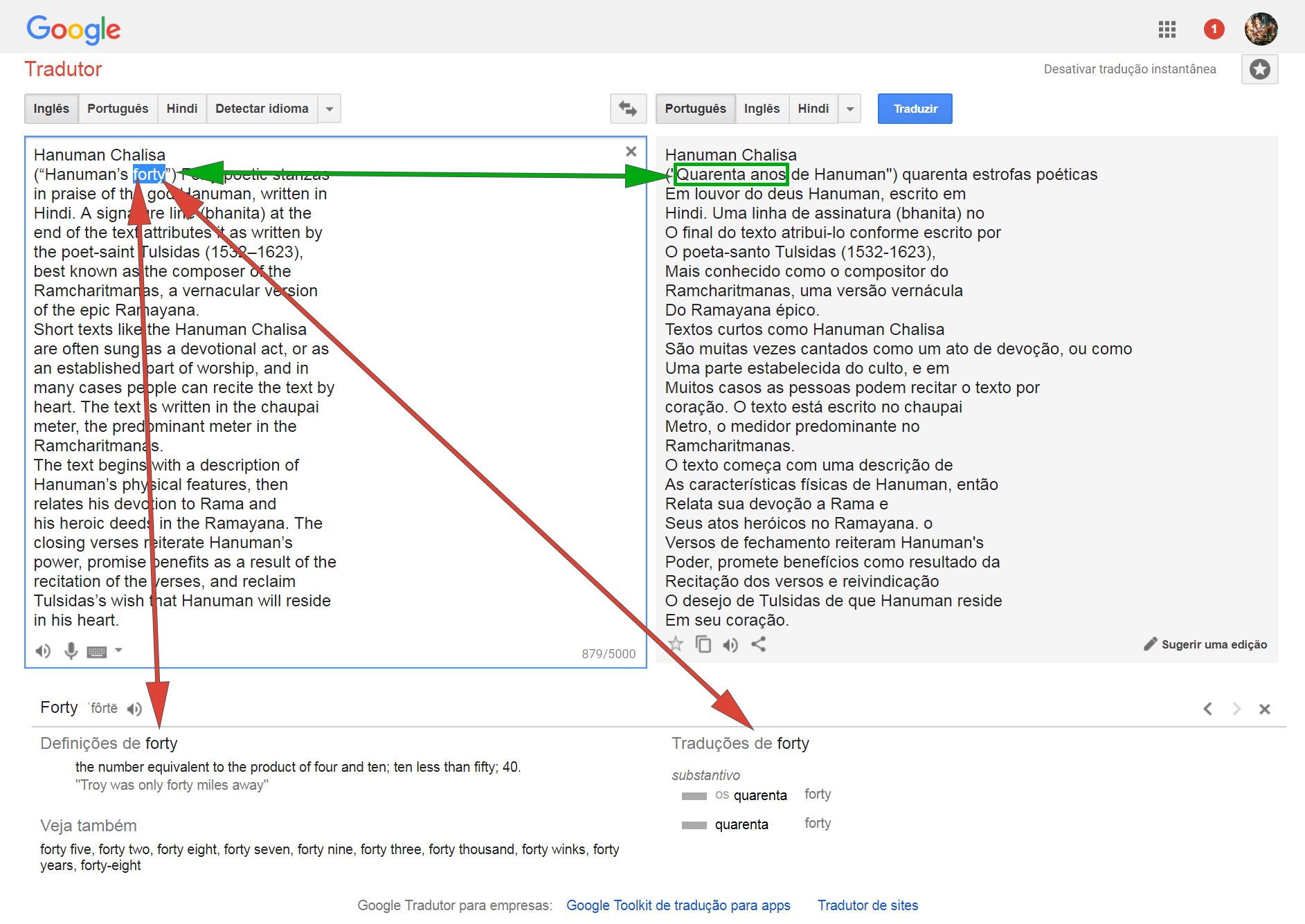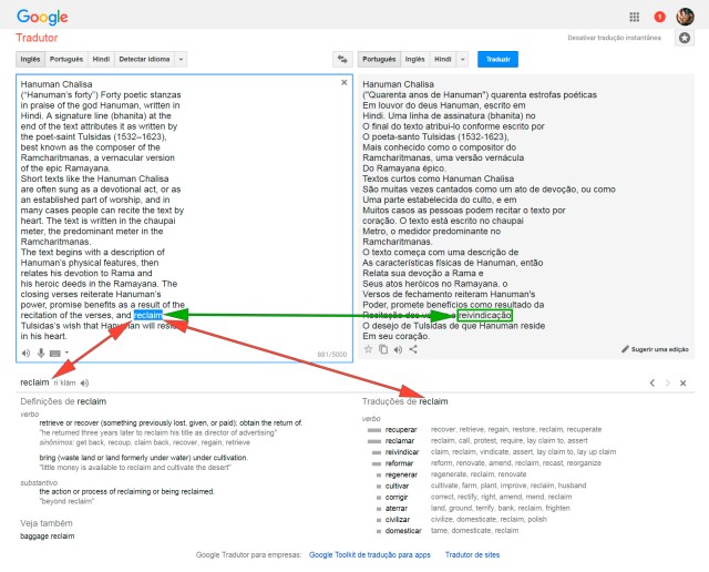 Alguma palavra cuja tradução não faça sentido ou que não tenhamos certeza de estar correta, selecionamos com o mouse e logo aparecem embaixo na própria página do Tradutor definições e traduções daquela palavra. Para este caso, como exemplo, selecionamos as palavras “forty”, “reclaim” e “summation”.