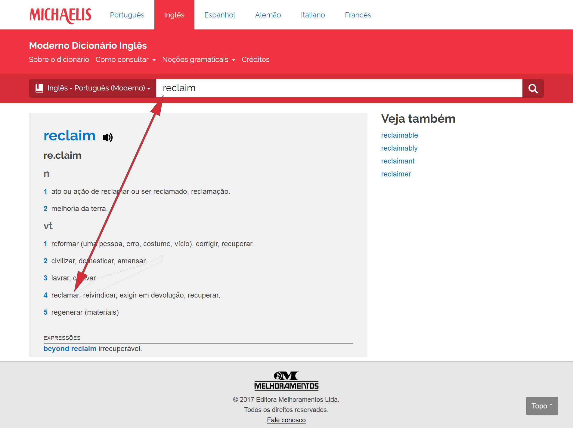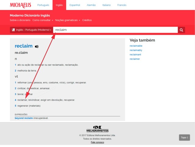 Em seguida vamos à palavra “reclaim”, que o Tradutor traduz no texto como “reivindicação”, embora abaixo liste 10 possíveis significados em português, dentre as quais “reclamar”
