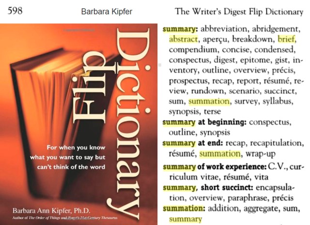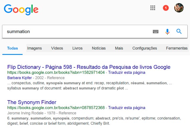Para tirarmos a dúvida e obtermos maior certeza sobre o significado de “resumo” para a palavra “summation” vamos a uma pesquisa desta última no Google. Após verificarmos vários endereços do resultado dessa consulta, encontramos no Google Books duas informações que corroboram que “summation” pode sim significar “resumo“: