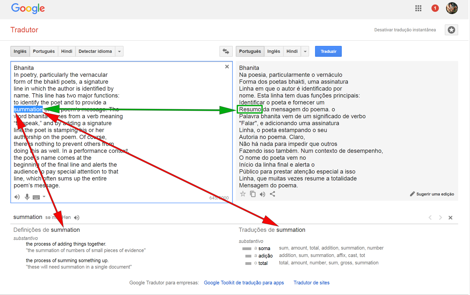 Vamos agora à palavra “summation” que o Tradutor traduz no texto em Português como “resumo” mas elenca abaixo como traduções apenas as palavras “soma”, “adição” e “total”: