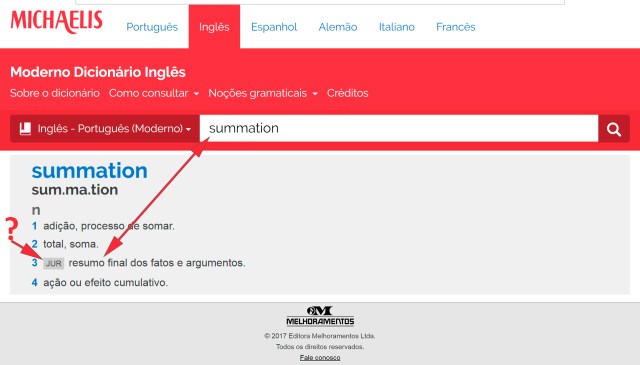 Também o Michaelis dá as mesmas palavras que o Tradutor como traduções de “summation”, entretanto informa que ela também tem o significado jurídico de “resumo final dos fatos e argumentos”: