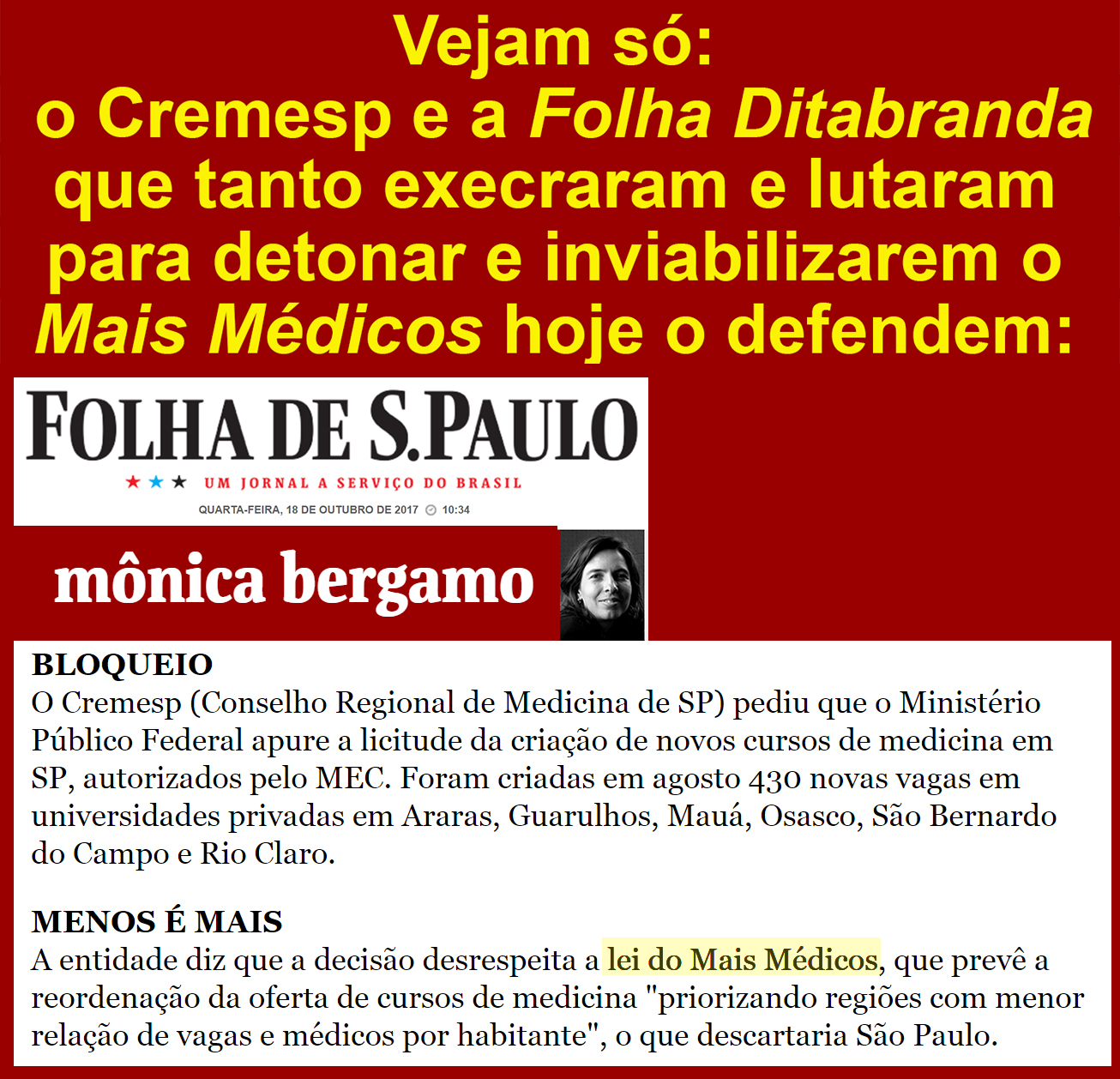 Cremesp e Folha defendem a Lei do “Mais Médicos” out18 r humborges Nada como um dia depois do outro. O tempo é o senhor da razão! Compartilhe isso: Clique para compartilhar no X(abre em nova janela) 18+ Clique para compartilhar no Facebook(abre em nova janela) Facebook Mais Clique para compartilhar no WhatsApp(abre em nova janela) WhatsApp Curtir Carregando... Relacionado