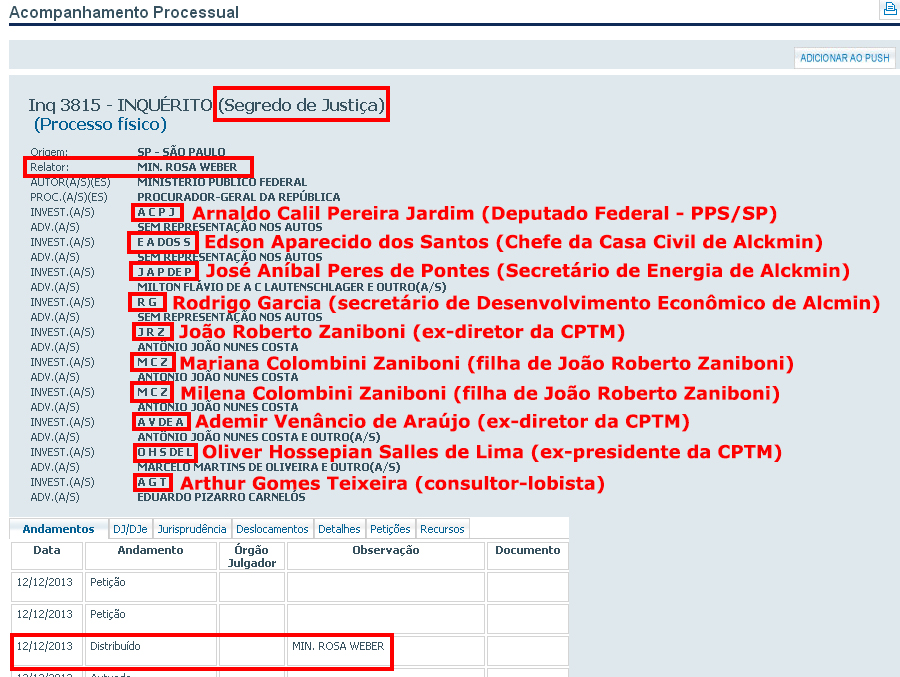 A pedido da Polícia Federal que está investigando o caso do Trensalão, a Justiça Federal em São Paulo encaminhou o Inquérito 3815 para o Supremo Tribunal Federal, que terá a relatoria da Ministra Rosa Weber: