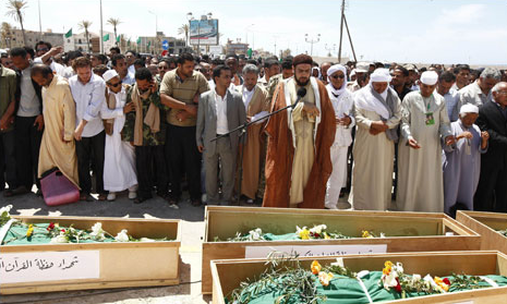 Em 13/05/2011 a OTAN bombardeou uma casa de chá em Brega onde estava uma delegação com mais de uma centena de religiosos desarmados a caminho de Benghazi para tentar uma conciliação entre as partes em conflito. Nesse massacre deliberado para impedir a busca da paz entre os líbios a OTAN matou 11 Imans e deixou outros 47 membros da delegação feridos.